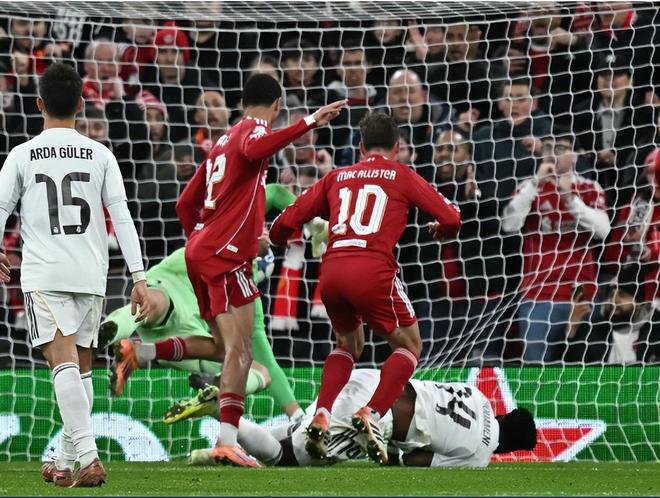 下半場(chǎng)回來(lái)利物浦依然牢牢將皇馬壓制,在之后的2次角球進(jìn)攻當(dāng)中,范戴克與埃基蒂克先后近距離頭球攻門(mén),庫(kù)爾圖瓦2次無(wú)解神撲將利物浦的進(jìn)球拒之門(mén)外。第52分鐘,索博斯洛伊任意球攻門(mén),庫(kù)爾圖瓦側(cè)身飛撲再次撲救;只是雙拳終究是難擋四手,第61分鐘,索博斯洛伊右側(cè)斜45度精準(zhǔn)傳中,麥卡利斯特中路搶點(diǎn)頭球入網(wǎng),1:0!