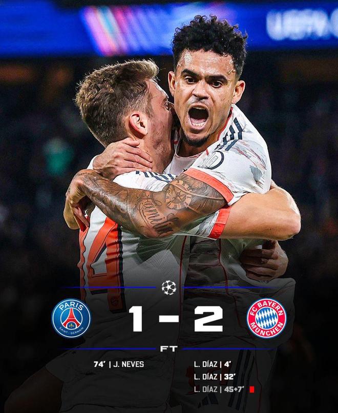 少打一人的的拜仁在下半場(chǎng)被迫收縮,而巴黎利用人數(shù)優(yōu)勢(shì)狂攻。直到第74分鐘,李剛?cè)视衣菲鹎颍舭?內(nèi)維斯掃射扳回一城,大巴黎1-2拜仁,最終比分也是定格在此。本場(chǎng)比賽過(guò)后,大巴黎3連勝終結(jié),拜仁則是各項(xiàng)賽事豪取16連勝,強(qiáng)勢(shì)領(lǐng)跑歐冠積分榜。